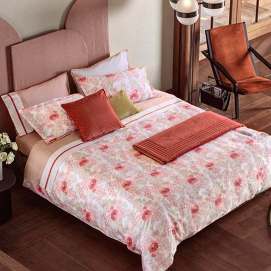 Entrambi i lati del copripiumino e le federe a quattro piccoli volani rifinite con sottile cordonetto sono in Raso 300 TC stampato a 12 colori. Sistema di fissaggio Twins® 2 piazze: copripiumino 250×260 cm – federe 52×82 cm